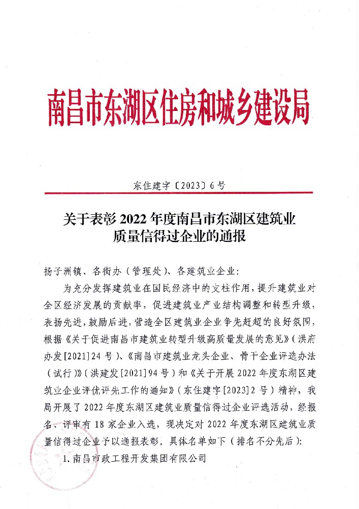 近日,南昌市东湖区住房和城乡建设局发布《关于表彰2022年度南昌市东湖区建筑业质量信得过企业的通报》(东住建字【2023】6号),经过严格评定,南昌市建筑工程集团有限公司凭借良好的企业信誉和行业业绩,获评“2022年度南昌市东湖区建筑业质量信得过企业”。珍惜荣誉,迎接挑战。南昌市建筑工程集团有限公司将把荣誉转化为...
